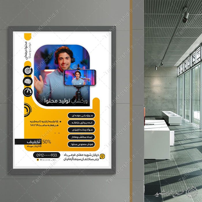 از این طرح پوستر ورکشاپ اموزش تولید محتوا . میتوانید برای تبلیغات آموزشگاه ها یا ثبت نام کلاس های ساخت محتوا استفاده نمایید. این طرح کاملا لایه باز هست و میتوانید مطالب و تصاویر خودتون جایگزین کنید.