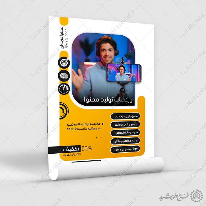 طرح پوستر دوره اموزش تولید محتوا و محتوا سازی . میتوانید برای تبلیغات آموزشگاه ها یا ثبت نام کلاس های ساخت محتوا استفاده نمایید. این طرح کاملا لایه باز هست و میتوانید مطالب و تصاویر خودتون جایگزین کنید.