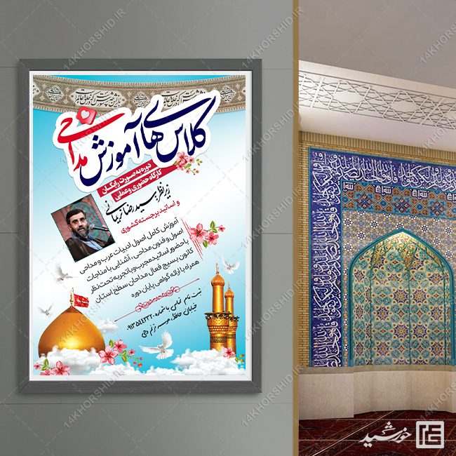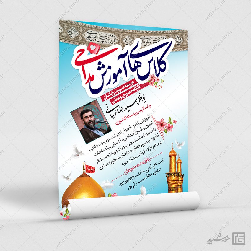 طرح پوستر کلاس مداحی میتوانید برای تبلیغات ثبت نام کلاس مداحی و دوره های مداحی . یا کارگاه های ثربت مداح استفاده نمایید. همچنین طرح پوستر مداحی کاملاَ لایه باز هست، و میتوانید مطالب و تصاویر خودتون جایگزین کنید.