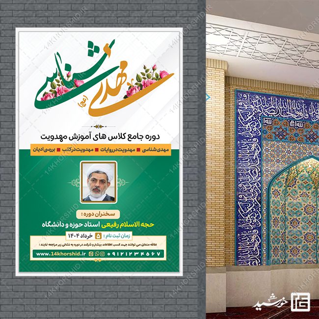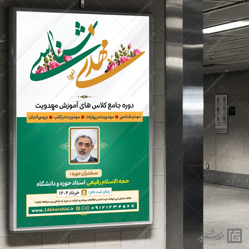 بنر برای کلاس و دوره های مهدی شناسی لایه باز برای چاپ و طراحی لایه باز روی فلکس و یا بنر مناسب است. شما میتوانید این فایل را در فتوشاپ ویرایش نمایید و همه قسمت ها رو به دلخواه تغییر بدید.