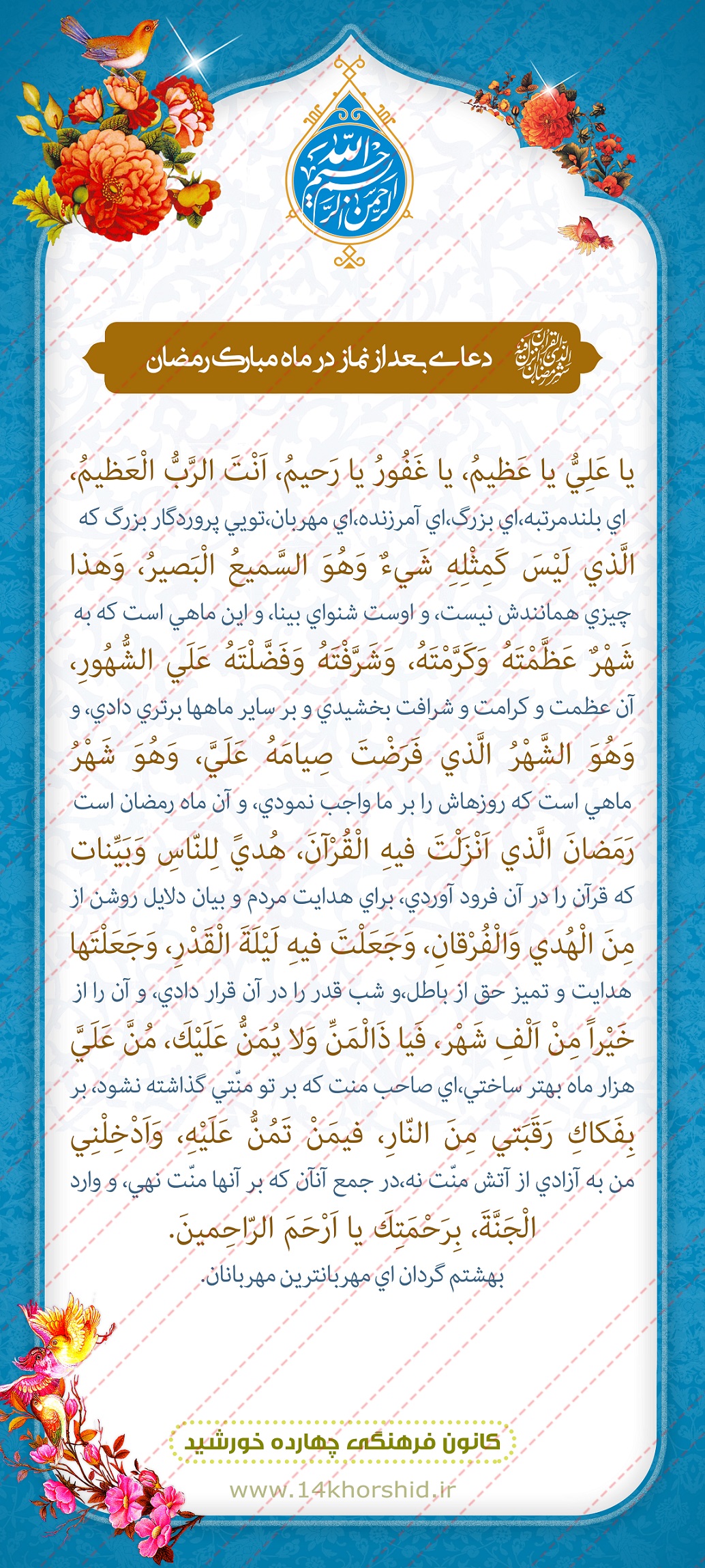 در این پست برای شما عزیزان طرح لایه باز دعای یا علی یا عظیم ماه رمضان psd منتشر کردیم، فایل لایه باز بوده ومی توانید در نرم افزار قدرتمند فتوشاپ به دلخواه در تمامی قسمت ها تغییرات ایجاد نمایید.