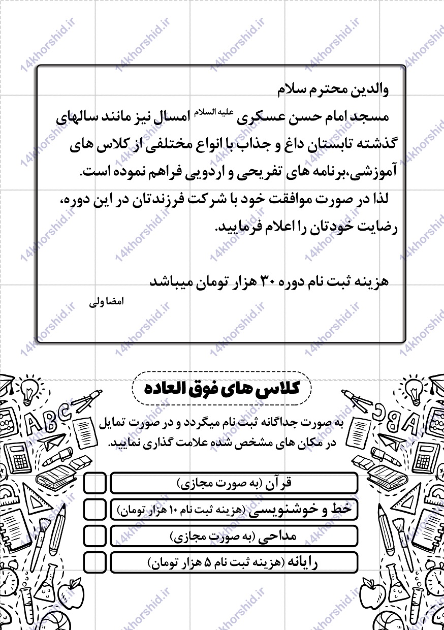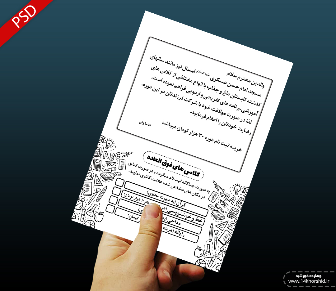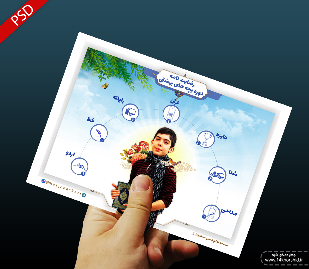 در این پست برای شما عزیزان طرح لایه باز تراکت و رضایتنامه دوره های فرهنگی psd برای دانش آموزان و شرکت کنندگان در دوره و اولیا قرار دادیم.طراحی این فایل بسیار با کیفیت می باشد وجهت چاپ روی انواع برگه A4/A3/A2 مناسب است..