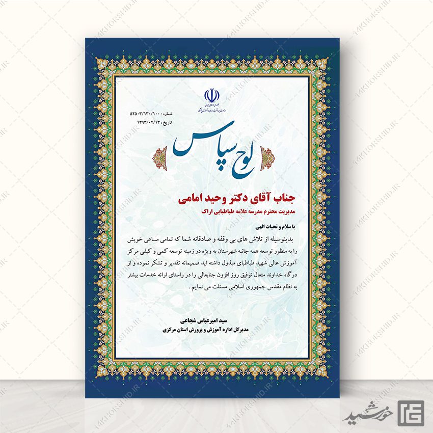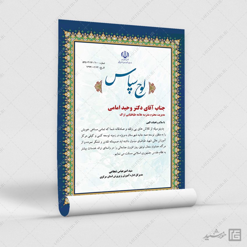 لوح تقدیر تذهیب یا طرح لایه باز لوح تقدیر با کادر تذهیب . شما میتوانید این فایل لایه باز لوح سپاس لایه باز را در فتوشاپ ویرایش نمایید و همه قسمت ها رو به دلخواه تغییر بدید.