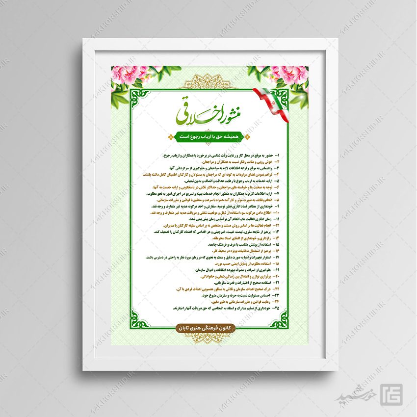 در این پست برای شما عزیزان طرح لایه باز منشور اخلاقی psd برای ادارات و سازمان ها قرار دادیم. وجهت چاپ روی انواع برگه A4/A3/A2 و یا بنر و فلکس مناسب است.