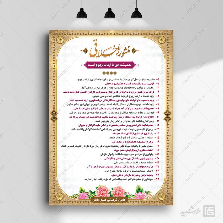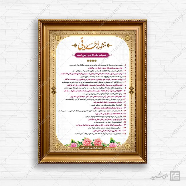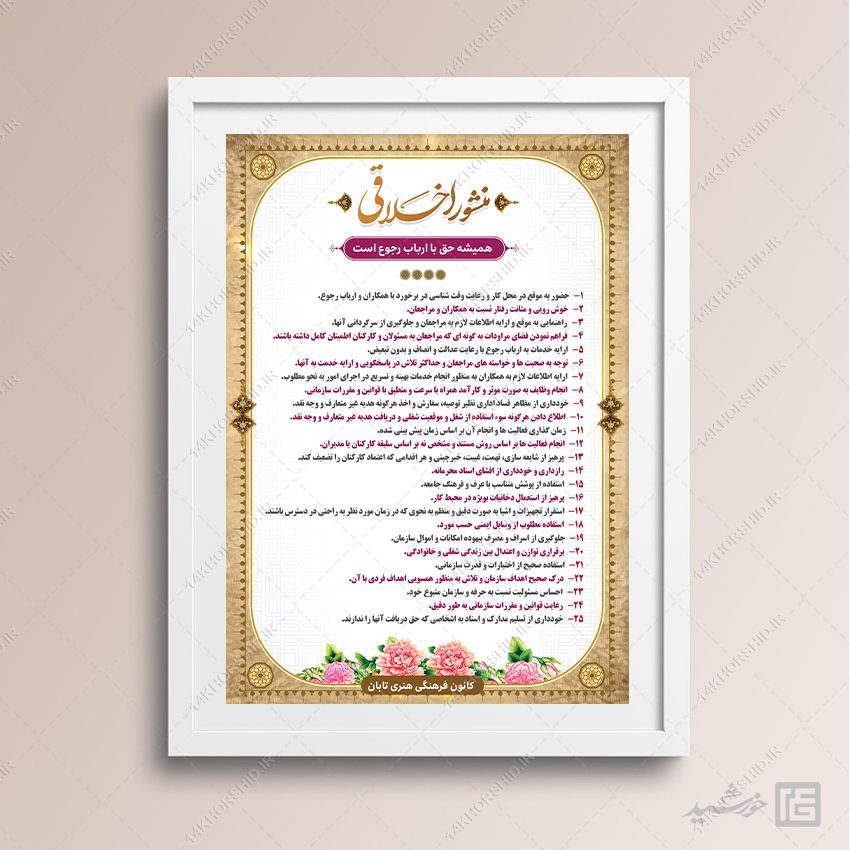 در این پست برای شما عزیزان طرح لایه باز منشور اخلاقی psd برای ادارات و سازمان ها قرار دادیم. وجهت چاپ روی انواع برگه A4/A3/A2 و یا بنر و فلکس مناسب است.