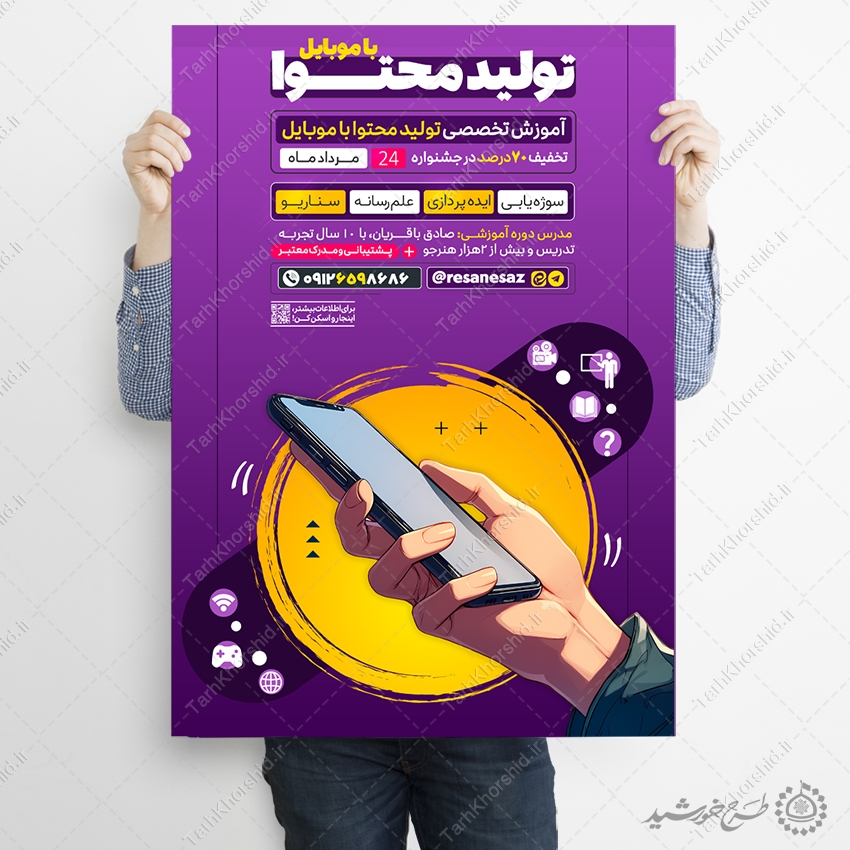 از این طرح پوستر برای تبلیغات در رابطه با موضوع تولید محتوا با موبایل . میتوانید برای تبلیغات کلاس های آموزشی تولید محتوا و سواد رسانه استفاده نمایید. این طرح کاملا لایه باز هست و میتوانید مطالب و تصاویر خودتون جایگزین کنید.