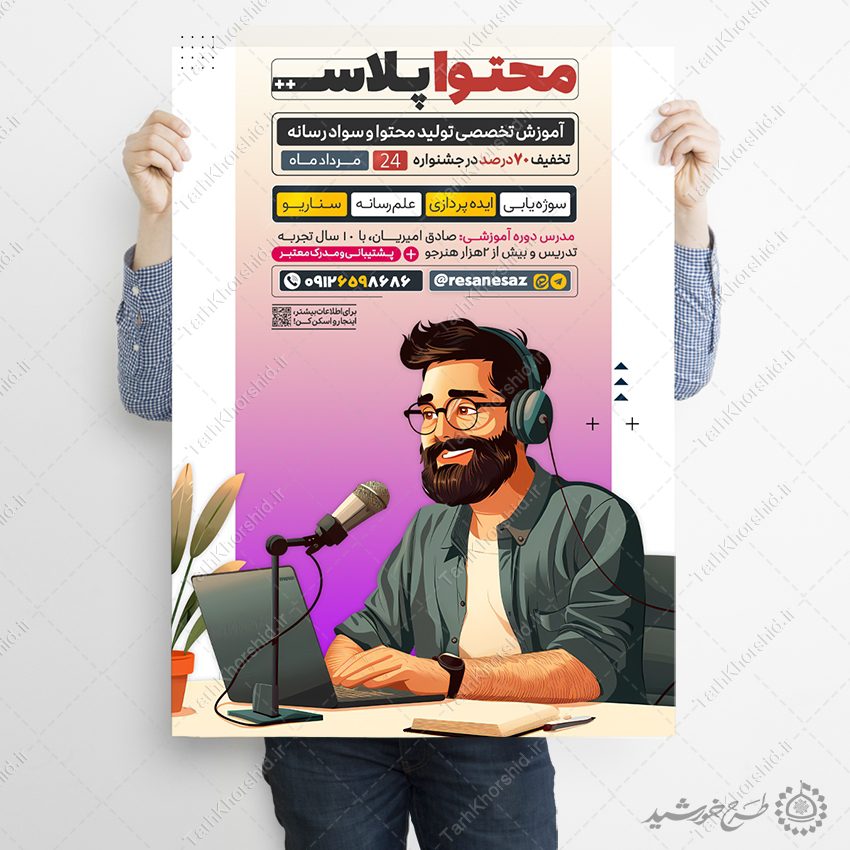 طرح پوستر برای تبلیغات در رابطه با موضوع تولید محتوا . میتوانید برای تبلیغات کلاس های آموزشی تولید محتوا و سواد رسانه استفاده نمایید. این طرح کاملا لایه باز هست و میتوانید مطالب و تصاویر خودتون جایگزین کنید.