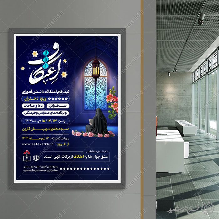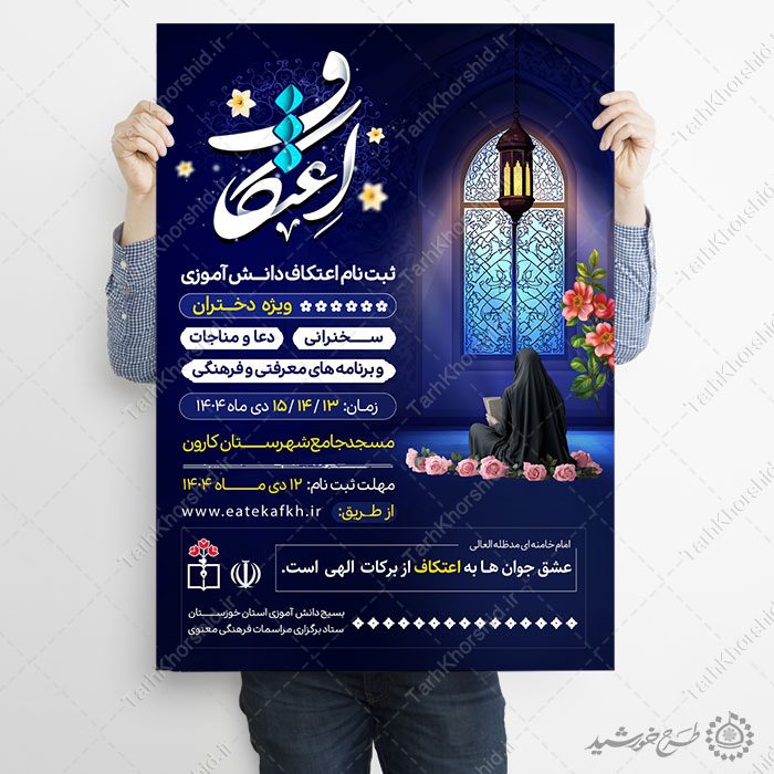 پوستر با خطاطی مذهبی ایرانی برای ثبت نام با موضوع اعتکاف . میتوانید برای تبلیغات برگزاری مراسم اعتکاف دعا و مناجات استفاده نمایید. این طرح کاملا لایه باز هست و میتوانید مطالب و تصاویر خودتون جایگزین کنید.