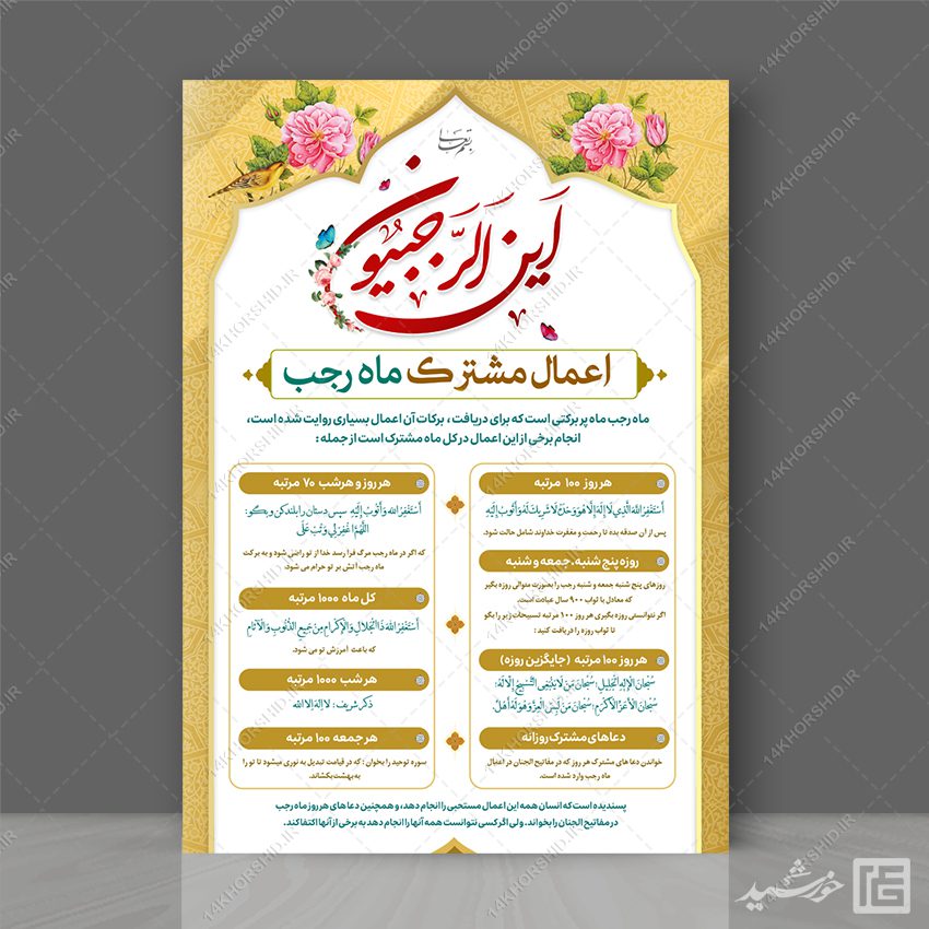 از طرح پوستر تبلیغاتی دعاهای ماه رجب میتوانید برای تبلیغات یا چاپ اعمال و دعاهای رجب استفاده نمایید. این طرح کاملا لایه باز هست و میتوانید مطالب و تصاویر خودتون جایگزین کنید.