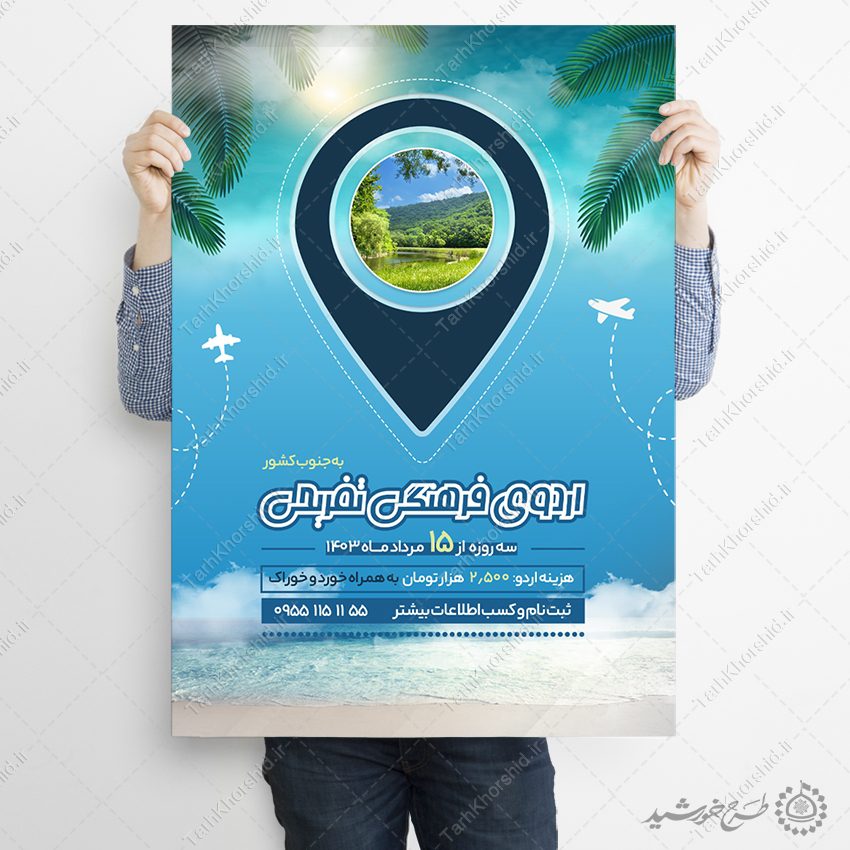 به نام خدا پوستر تور فرهنگی گردشگری فراخوان اردوی فرهنگی تفریحی به جنوب یا طرح پوستر لایه باز تور های فرهنگی تفریحی به جنوب کشور . برای استفاده در طراحی جهت یا تبلیغات مناسب است. شما میتوانید این فایل لایه باز پوستر آگهی ثبت نام اردوی تفریحی برای جنوب کشور را در فتوشاپ ویرایش نمایید. و همه قسمت ها رو به دلخواه تغییر بدید.
