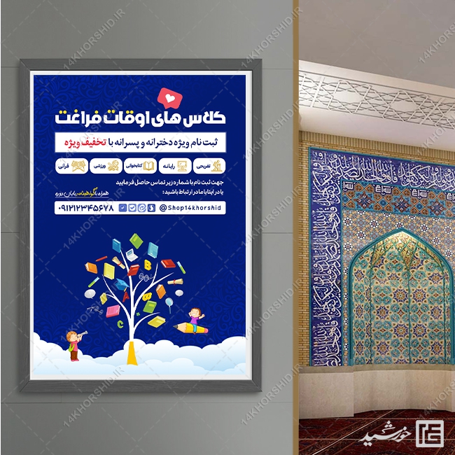 به نام خدا پوستر دوره های اوقات فراغت یا طرح پوستر کلاس های تابستان . برای استفاده در طراحی جهت چاپ روی انواع برگه A4/A2 /A3 و بنر مجازی مناسب است. شما میتوانید این فایل لایه باز دوره یا کلاس های اوقات فراغت را در فتوشاپ ویرایش نمایید و همه قسمت ها رو به دلخواه تغییر بدید.