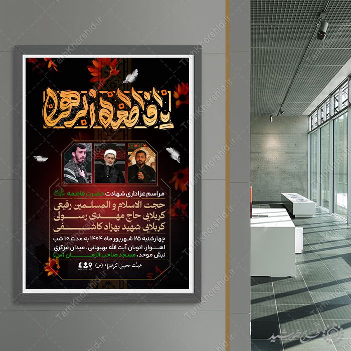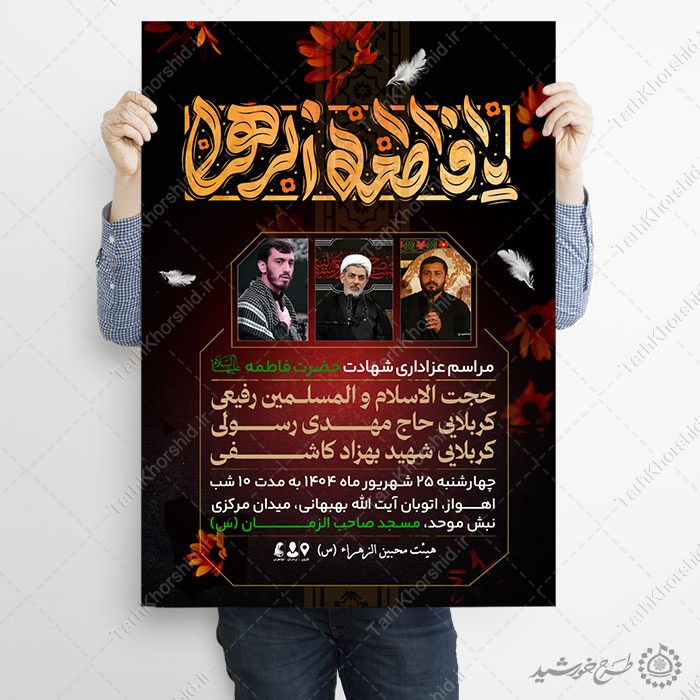 پوستر دهه فاطمیه تبلیغاتی با موضوع اطلاعیه برگزاری عزاداری مجالس ایام فاطمیه . میتوانید برای تبلیغات مداحی و مراسمات و ایام شهادت استفاده نمایید. این طرح کاملا لایه باز هست و میتوانید مطالب و تصاویر خودتون جایگزین کنید.