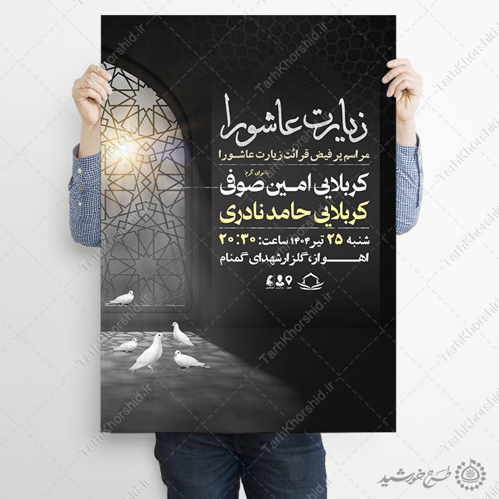 پوستر اطلاعیه زیارت عاشورا لایه باز مذهبی با المان اسلیمی نور و کبوتر برای اطلاعیه مراسم زیارت عاشورا . میتوانید برای تبلیغات مداحی و مراسم دعا استفاده نمایید. این طرح کاملا لایه باز هست و میتوانید مطالب و تصاویر خودتون جایگزین کنید.