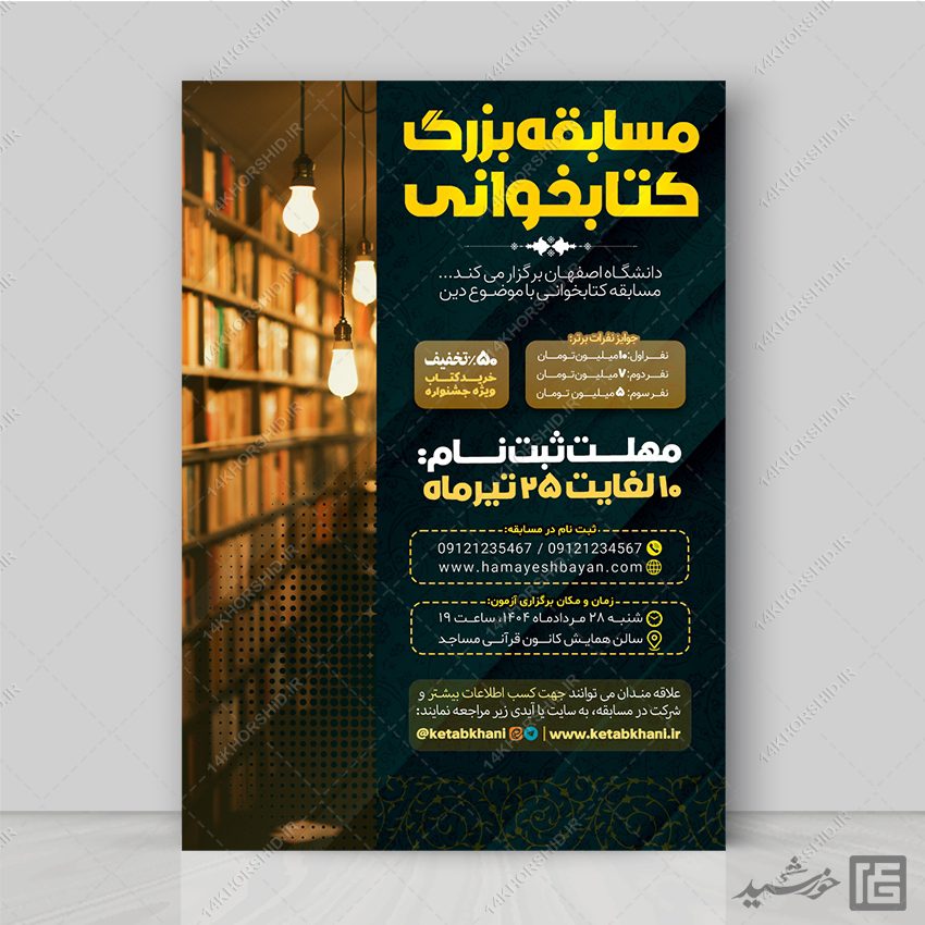 پوستر دانشگاهی مسابقات کتابخوانی دانشجویان و بزرگسالان میتوانید برای تبلیغات یا چاپ پوستر رسمی ویژه مسابقه کتابخوانی استفاده نمایید. این طرح کاملا لایه باز هست و میتوانید مطالب و تصاویر خودتون جایگزین کنید.