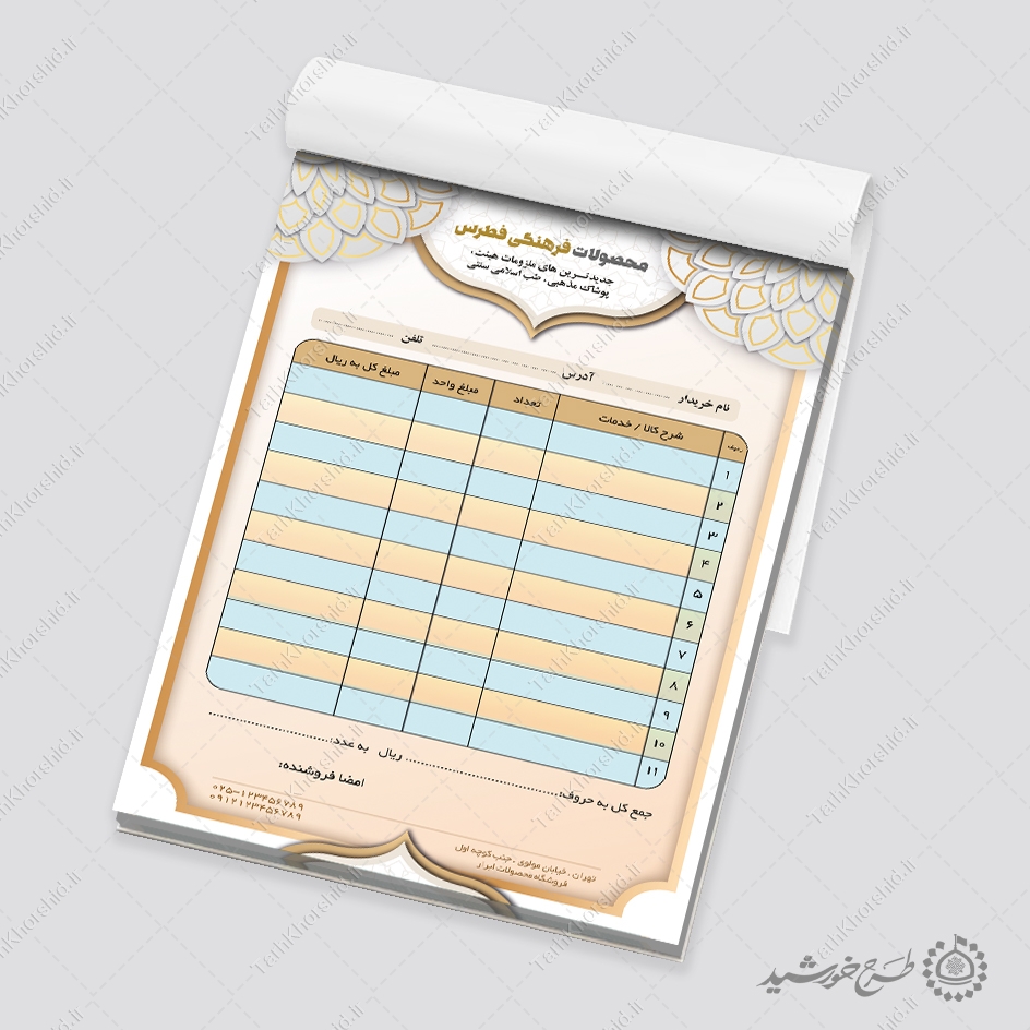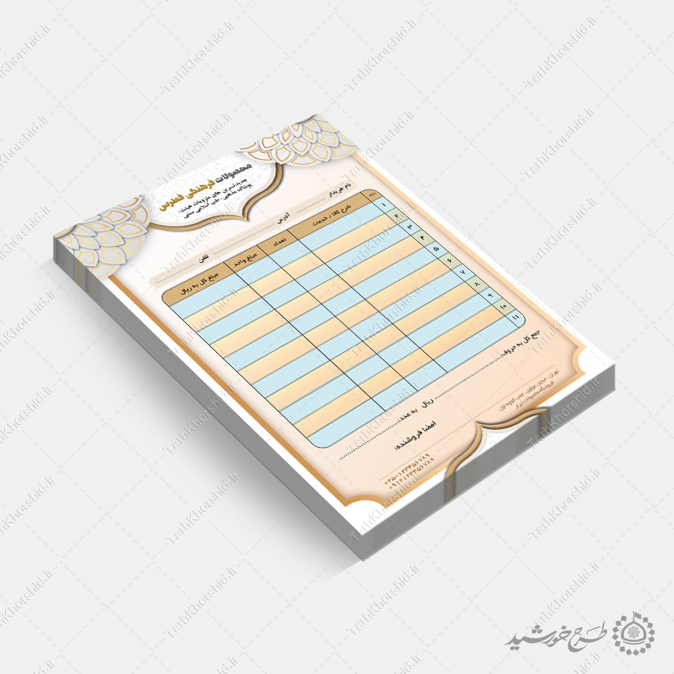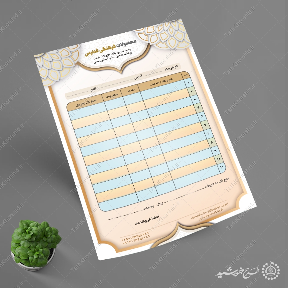 فاکتور فروش در فروشگاه های اسلامی ایرانی . میتوانید برای تبلیغات یا چاپ برای شرکت ها و فروشگاه ها استفاده نمایید. این طرح کاملا لایه باز هست و میتوانید مطالب و تصاویر خودتون جایگزین کنید.