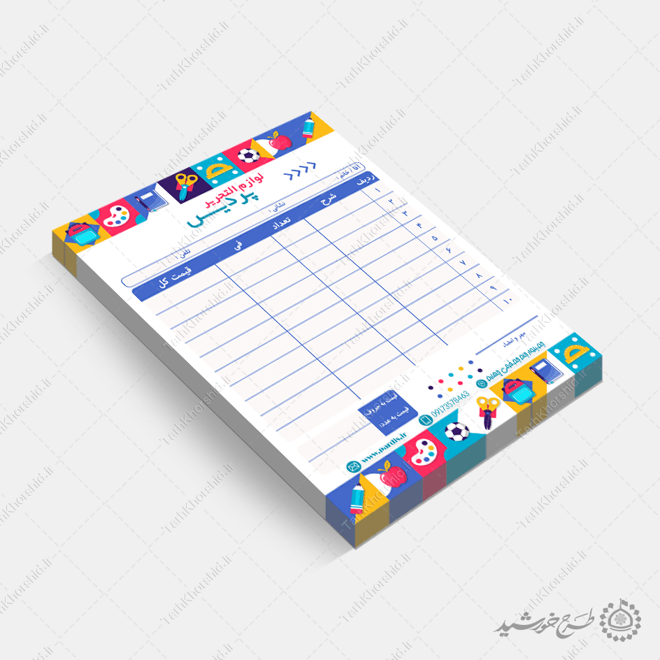 فاکتور فروش لایه باز لوازم تحریر . میتوانید برای تبلیغات یا چاپ برای شرکت ها و فروشگاه ها استفاده نمایید. این طرح کاملا لایه باز هست و میتوانید مطالب و تصاویر خودتون جایگزین کنید.