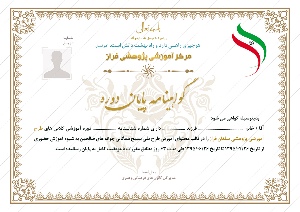 در این پست برای شما عزیزان فایل گواهینامه و مدرک پایان دوره لایه باز psd قرار دادیم.طراحی این فایل بسیار با کیفیت می باشد وجهت چاپ روی انواع برگه مناسب است.