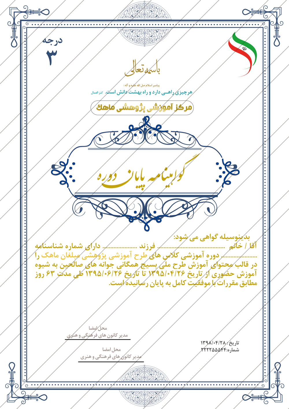 در این پست برای شما عزیزان فایل لایه باز گواهی ومدرک پایان دوره عمودی psd قرار دادیم.طراحی این فایل بسیار با کیفیت می باشد وجهت چاپ روی انواع برگه مناسب است.