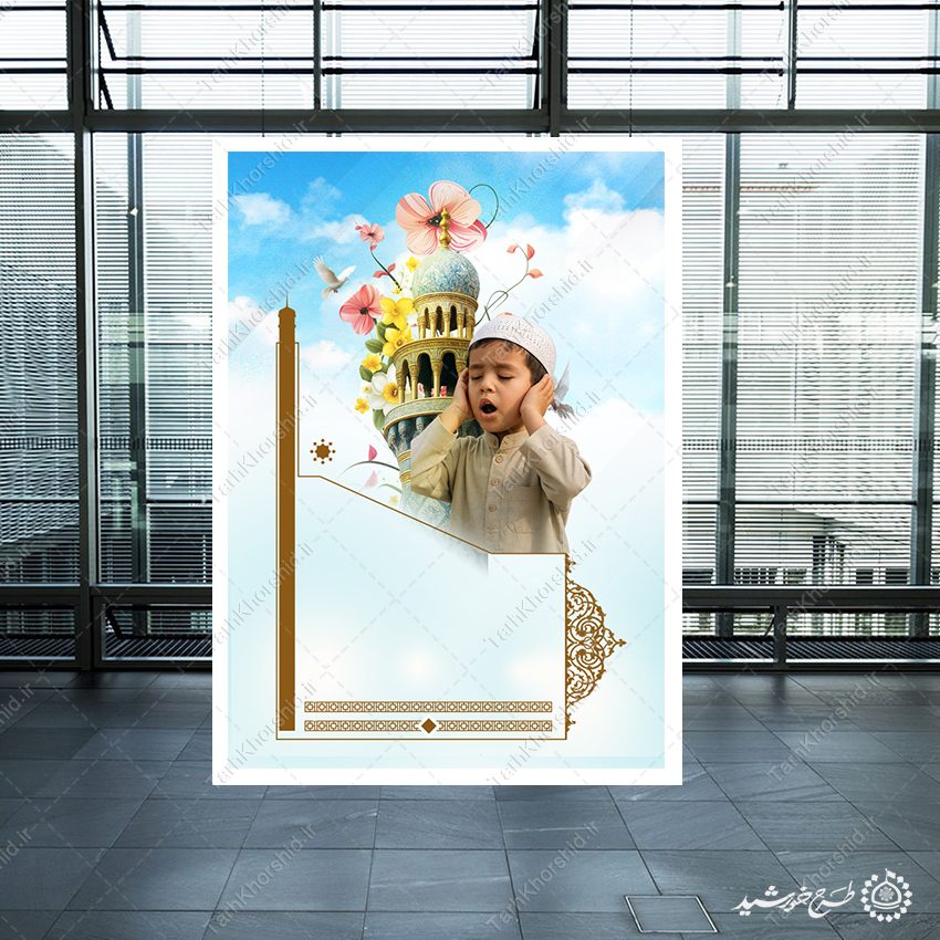 پوستر خام مناره و اذان مذهبی و فرهنگی با زمینه معنوی . میتوانید برای تبلیغات یا چاپ پوستر فرهنگی برای ادارات و موسسات و مراکز مذهبی استفاده نمایید. این طرح کاملا لایه باز هست و میتوانید مطالب و تصاویر خودتون جایگزین کنید.