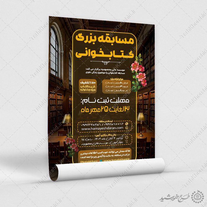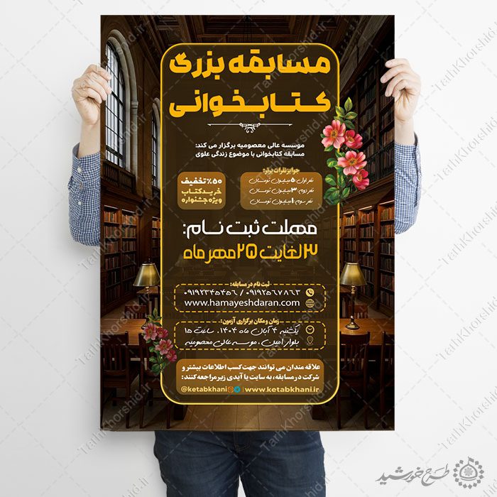 - طرح های مرتبط با پوستر برای مسابقه کتابخوانی و مطالعه کتاب را میتوانید در قسمت آرشیو مشاهده نمایید. آرشیو پوستر مسابقه کتاب