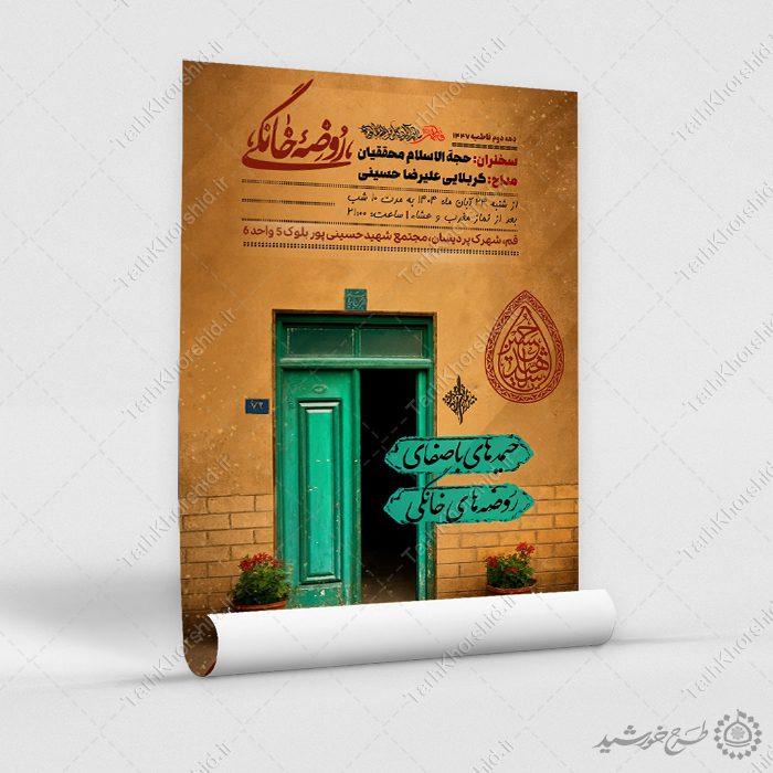 از پوستر با موضوع دعوت به روضه خانگی و عزاداری میتوانید برای تبلیغات یا چاپ پوستر برای اطلاعیه دعوت به روضه و عزاداری خانگی استفاده نمایید. این طرح کاملا لایه باز هست و میتوانید مطالب و تصاویر خودتون جایگزین کنید.
