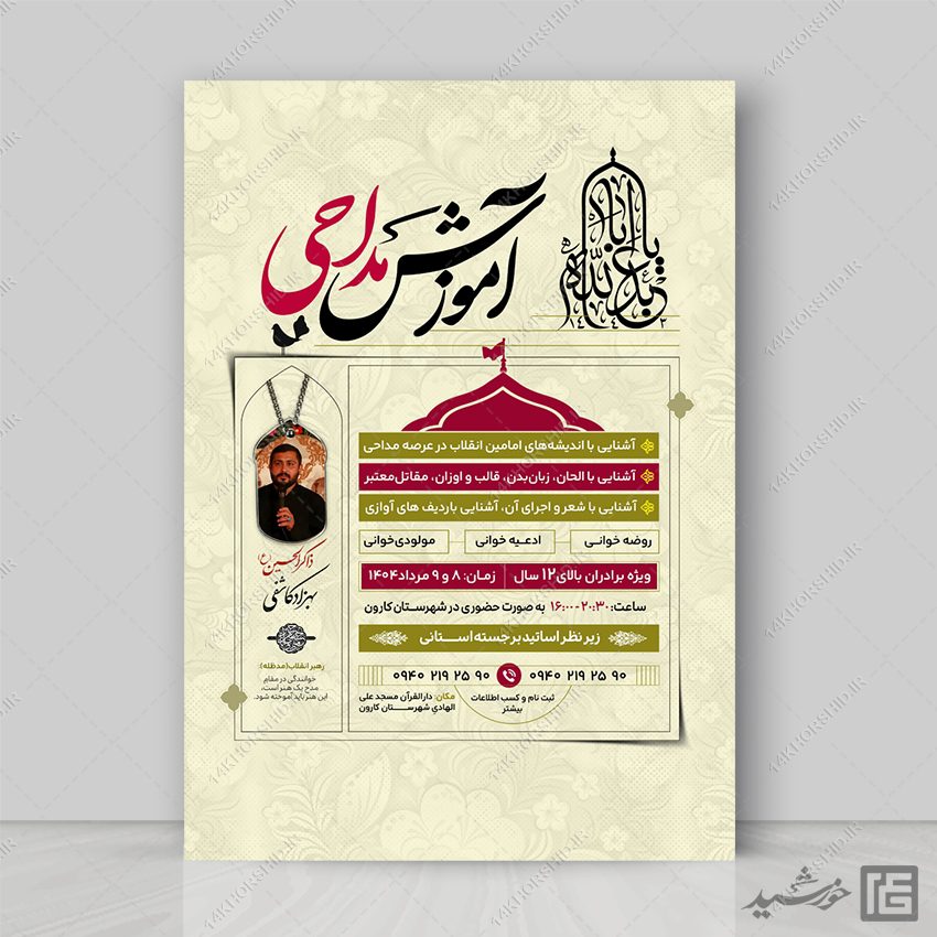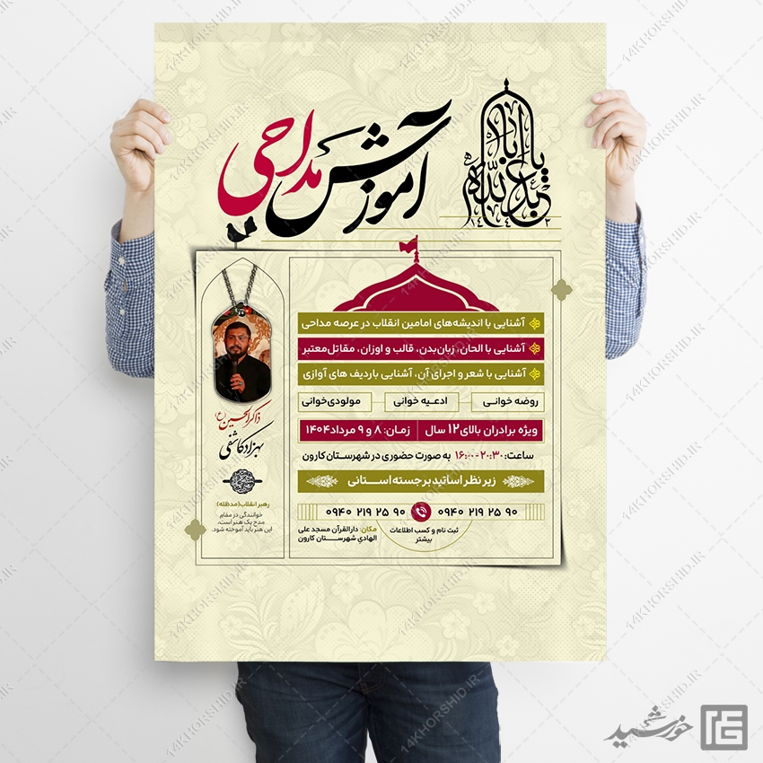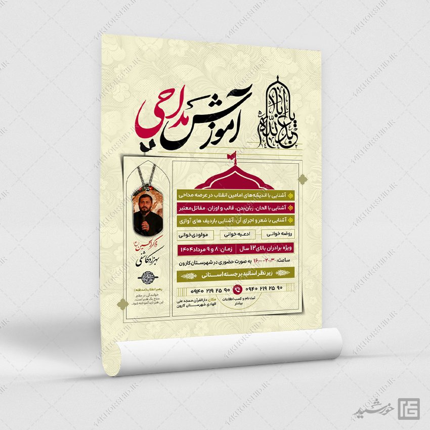 طرح پوستر آموزش مداحی میتوانید برای تبلیغات و اطلاعیه مداحی و دوره های مداحی . یا کارگاه های تربیت مداح استفاده نمایید. همچنین طرح پوستر مداحی کاملاَ لایه باز هست، و میتوانید مطالب و تصاویر خودتون جایگزین کنید.