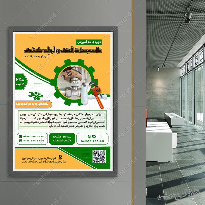 از این طرح پوستر برای تبلیغات آموزش مبتدی تا پیشرفته لوله کشی ساختمان . میتوانید برای تبلیغات یا ثبت نام کلاس های آموزشی تاسیسات استفاده نمایید. این طرح کاملا لایه باز هست و میتوانید مطالب و تصاویر خودتون جایگزین کنید.