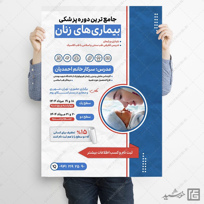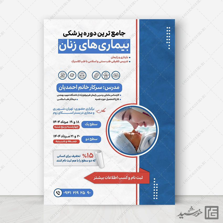 از طرح پوستر ثبت نام دوره بیماری شناسی زنان یا طرح لایه باز برای کلاس های بیماری زنان . یا طرح ثبت نام برای کلاس های پزشکی استفاده نمایید.
