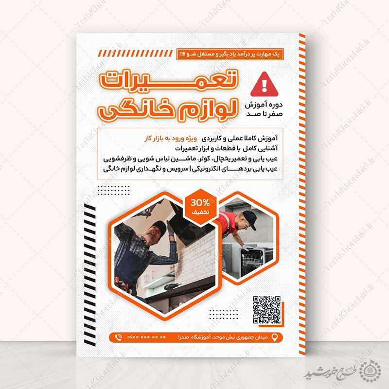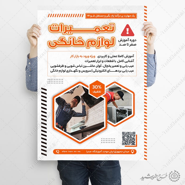 از این طرح پوستر دوره تعمیرات لوازم خانه کلاس های آموزشی تعمیر لوازم خانگی . میتوانید برای تبلیغات آموزشگاه ها یا ثبت نام کلاس های مهارتی تعمیراتی استفاده نمایید. این طرح کاملا لایه باز هست و میتوانید مطالب و تصاویر خودتون جایگزین کنید.