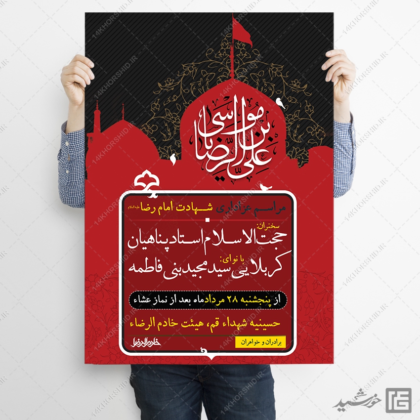 در این پست برای شما پوستر لایه باز مراسم شهادت امام رضا علیه السلام psd قرار دادیم. جهت استفاده در انواع طراحی و تبلیغات مناسب است.