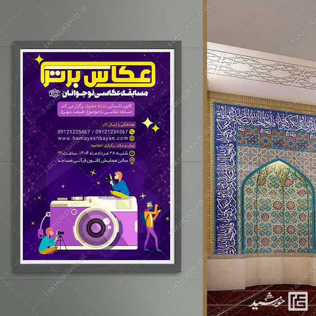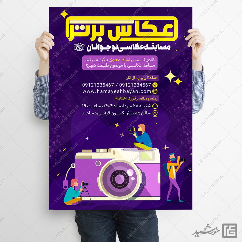 پوستر مسابقه عکاسی نوجوانان طرح پوستر ویژه مسابقه عکاسی جوانان لایه باز . برای استفاده در طراحی جهت چاپ روی انواع برگه A4/A2 /A3 و بنر مجازی مناسب است. شما میتوانید این فایل را در فتوشاپ ویرایش نمایید و همه قسمت ها رو به دلخواه تغییر بدید.