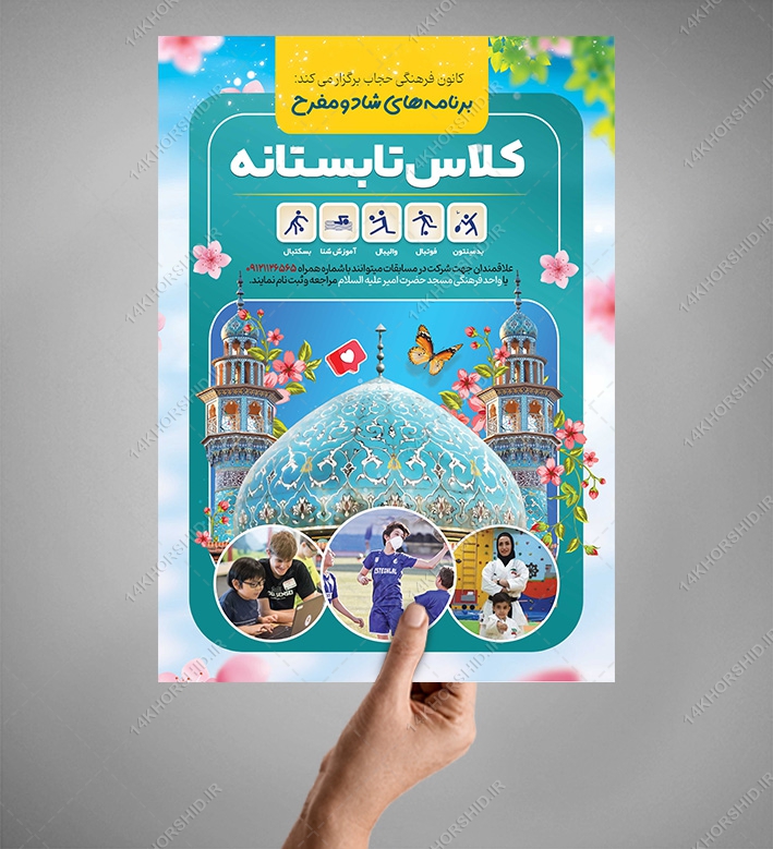 طرح پوستر کلاس های فرهنگی مسجد یا کلاس اوقات فراغت مسجد میتوانید برای تبلیغات ثبت نام دوره و کلاس یا اردو تابستان فرهنگی . یا دوره ها و کلاس های اوقات فراغت تابستان استفاده نمایید.