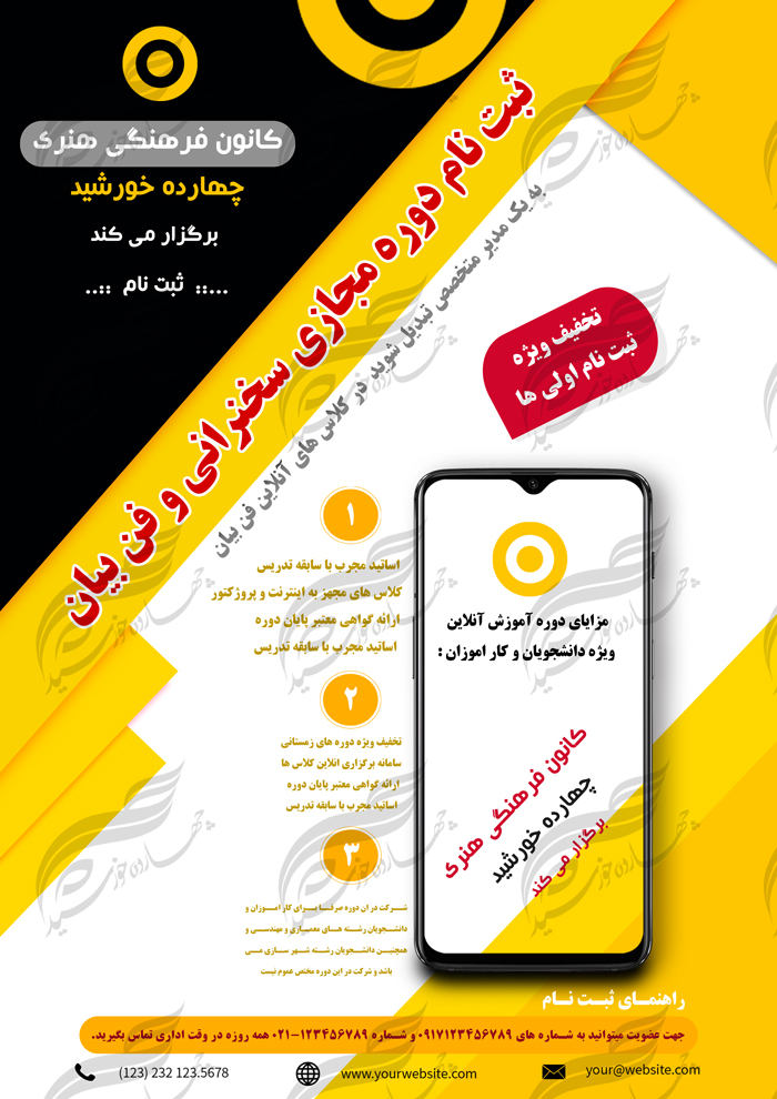 در این پست برای شما عزیزان پوستر و تراکت لایه باز کلاس آموزش آنلاین مجازی ۶ psd قرار دادیم.طراحی این فایل بسیار با کیفیت می باشد وجهت چاپ روی انواع برگه A4/A3/A2 مناسب است.