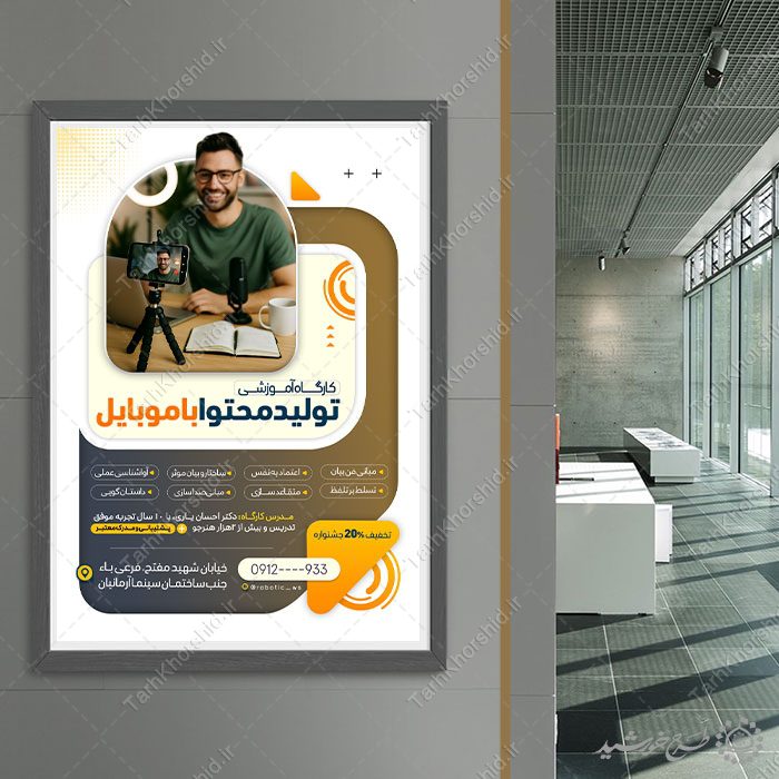از این طرح پوستر تولید محتوا با موبایل کلاس های اموزش محتوا سازی برای موبایل و فضای مجازی. میتوانید برای تبلیغات آموزشگاه ها یا ثبت نام کلاس های ساخت محتوا استفاده نمایید. این طرح کاملا لایه باز هست و میتوانید مطالب و تصاویر خودتون جایگزین کنید.