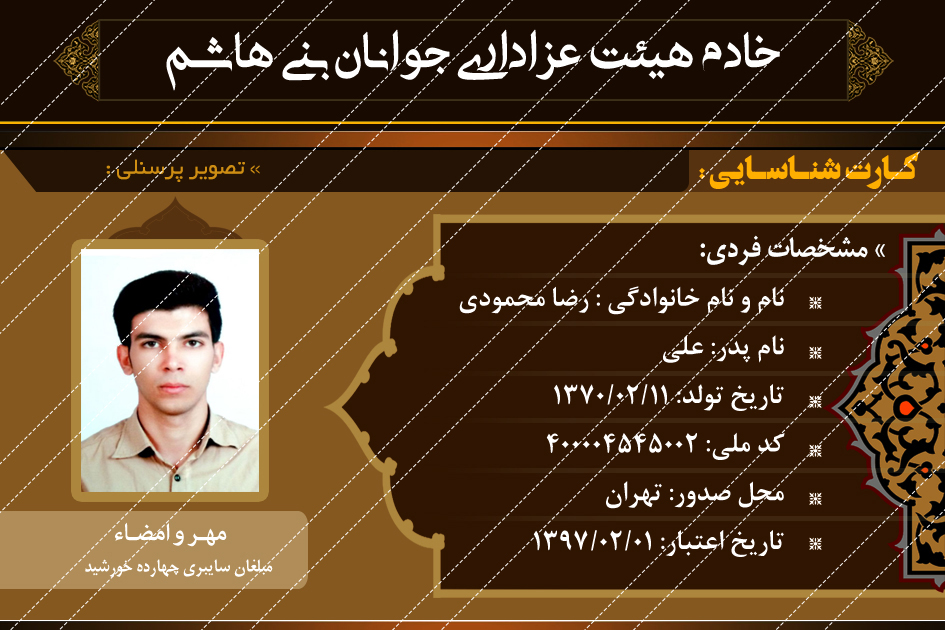 در این پست برای شما عزیزان کارت شناسایی لایه باز خادم هیئت psd منتشر کردیم، فایل لایه باز بوده ومی توانید در نرم افزار قدرتمند فتوشاپ به دلخواه در تمامی قسمت ها تغییرات ایجاد نمایید.