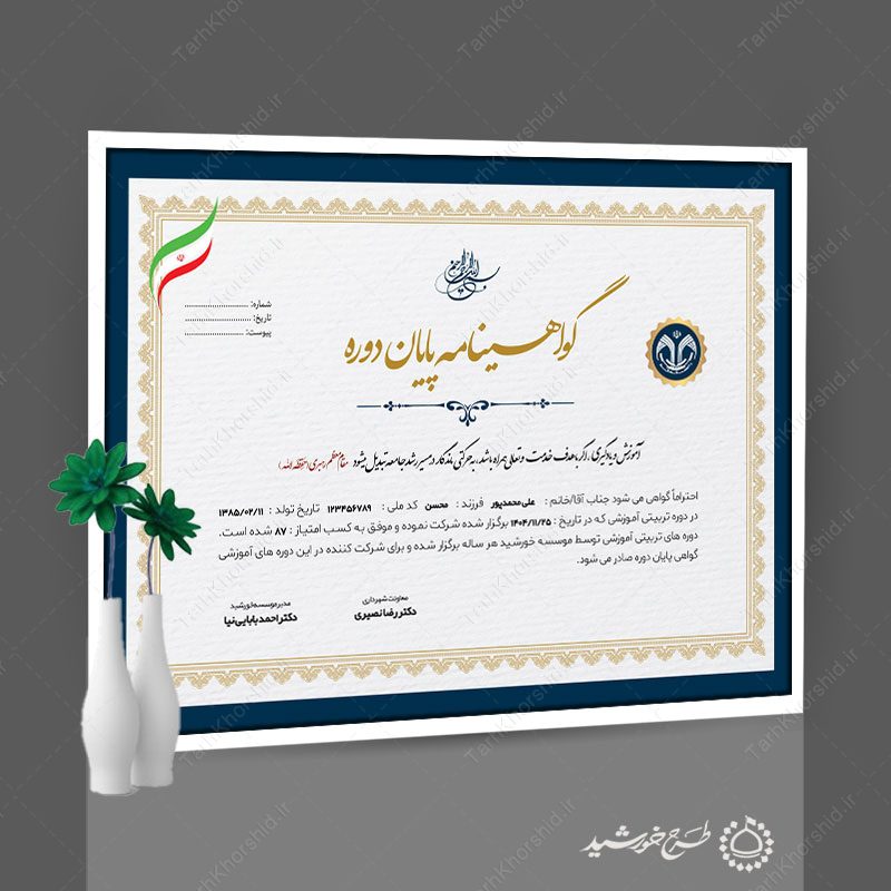 از طرح گواهینامه پایان دوره لایه باز میتوانید در انواع طراحی مدرک دوره های آموزشی استفاده نمایید یا برای صدور مدرک و گواهی برای موسسه و کلاس های فرهنگی یا دوره های اموزشی خودتون استفاده نمایید.